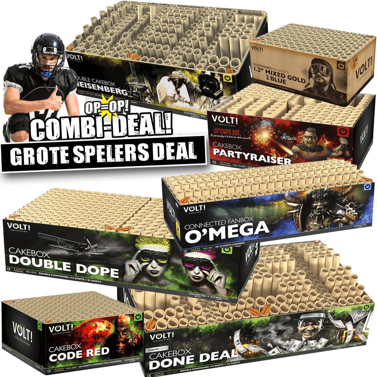 De VOLT! Grote Speler (7 Compound Cakeboxen) is uit de Combi Deals collectie gehaald en je kunt deze nooit meer bestellen. Uiteraard is er voldoende ander vuurwerk waar je uit kunt kiezen!